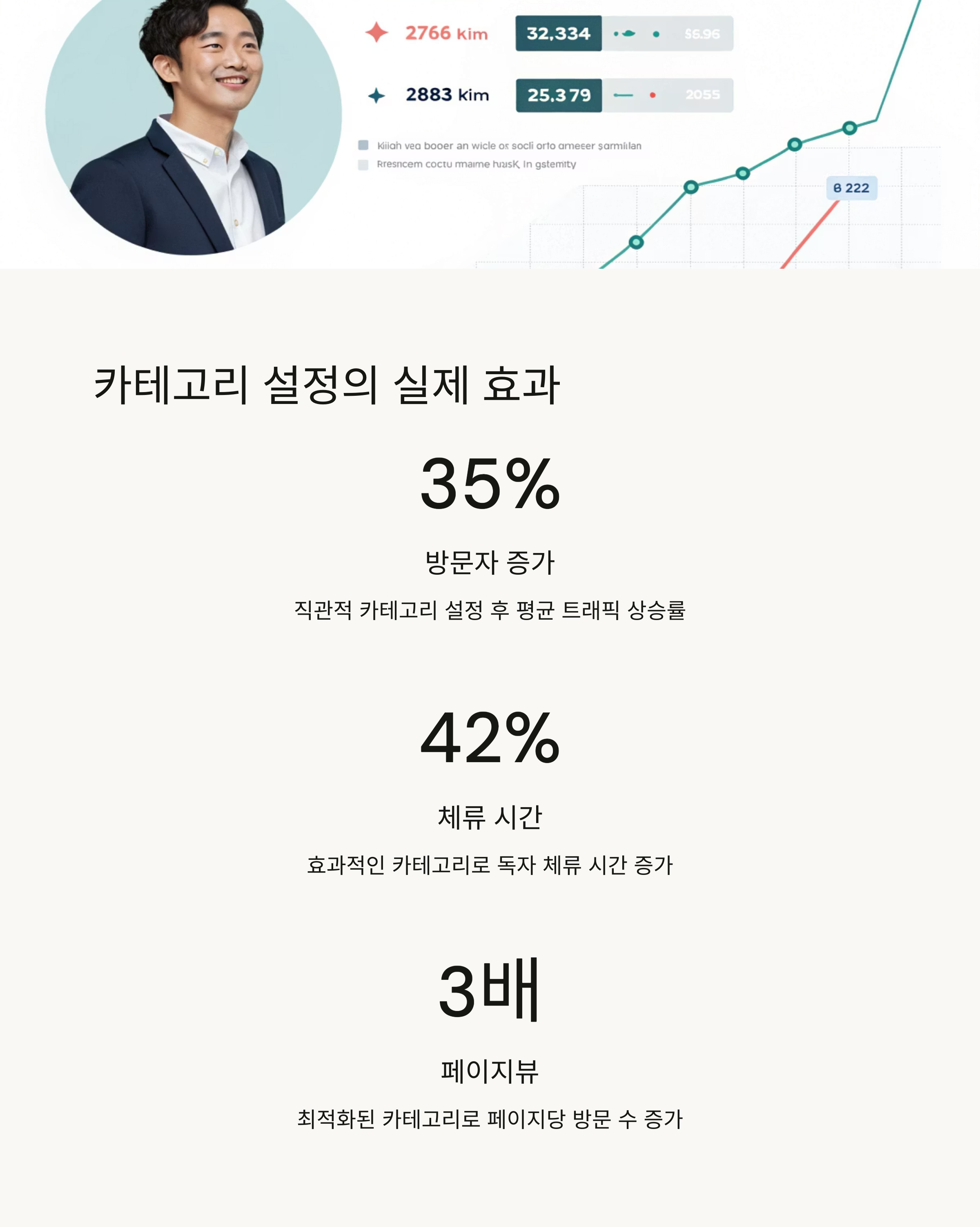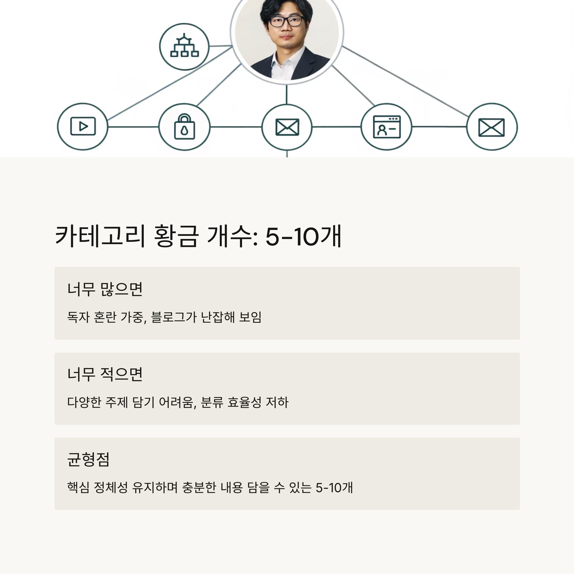 이 숫자는 블로그의 핵심 정체성을 유지하면서도 충분한 내용을 담을 수 있는 균형점입니다. 처음에는 큰 범위의 카테고리로 시작하되, 블로그가 성장함에 따라 인기 있는 카테고리를 세분화하는 유연성을 발휘할 수 있습니다.