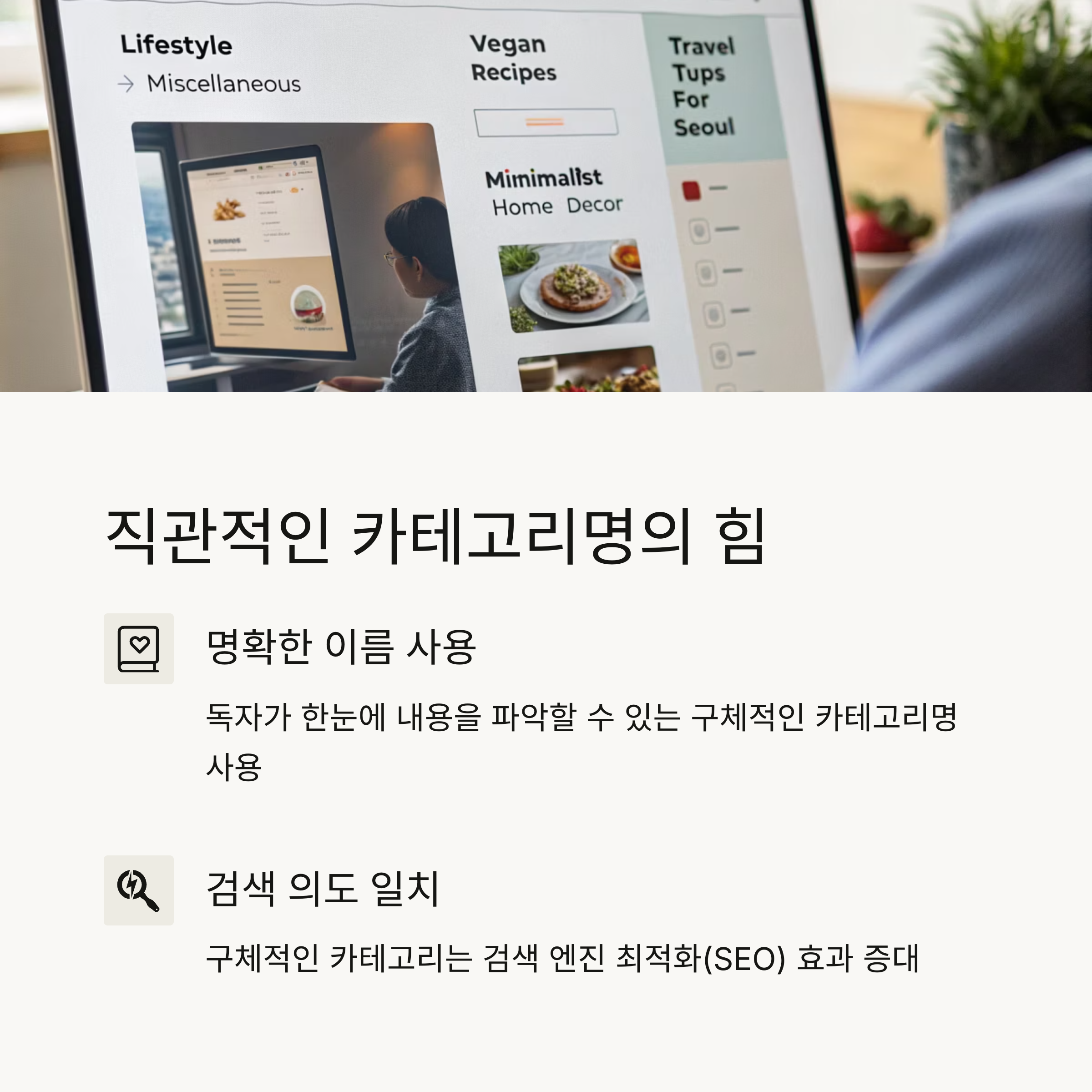 대신, '제주도 맛집 추천', '육아 필수템 리뷰', '파이썬 프로그래밍 기초'처럼 구체적인 내용을 담는 것이 좋습니다. 이렇게 명확한 카테고리명은 독자의 검색 의도와 일치하여 특정 정보를 찾는 사용자의 블로그 유입 증대에 기여합니다. 또한, 구체적인 카테고리는 검색 엔진이 블로그의 주제를 더 정확하게 파악하는 데 도움을 주어 SEO 효과를 높입니다.
