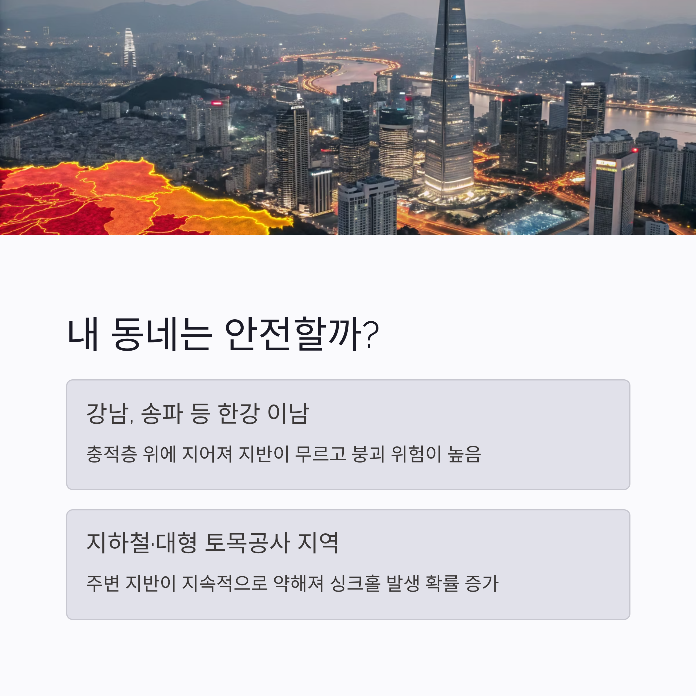 최근 서울 강남과 송파를 중심으로 도심 곳곳에서 싱크홀 사고가 빈번하게 발생하고 있습니다. 겉보기에는 멀쩡해 보이지만, 어느 날 갑자기 땅이 꺼지며 차량과 사람을 삼켜버리는 상황이 생기는 것이죠. 이번 글에서는 싱크홀이 왜 생기는지, 어떤 전조 증상을 통해 미리 알아챌 수 있는지, 그리고 특히 조심해야 할 지역은 어디인지 알아보겠습니다.