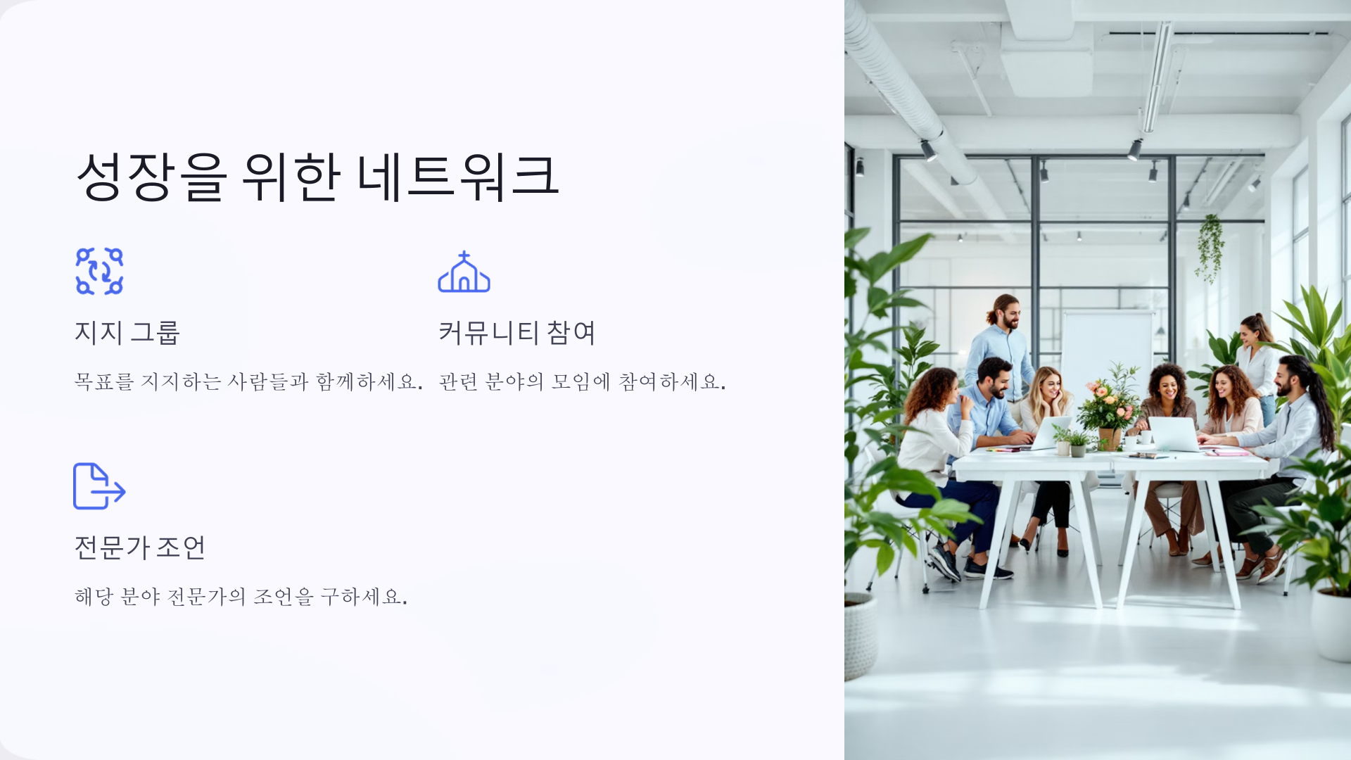 당신 주변의 사람들은 당신의 성장에 어떤 영향을 미치고 있습니까? 목표 달성을 지지하고 격려하는 사람들과 함께하십시오. 스터디 그룹, 운동 동호회 등 당신의 목표와 관련된 커뮤니티에 참여하여 긍정적인 에너지를 주고받으세요. 또한, 해당 분야 전문가의 조언을 구하거나 관련 정보를 적극적으로 탐색하여 목표 달성을 위한 최적의 환경을 조성하십시오.