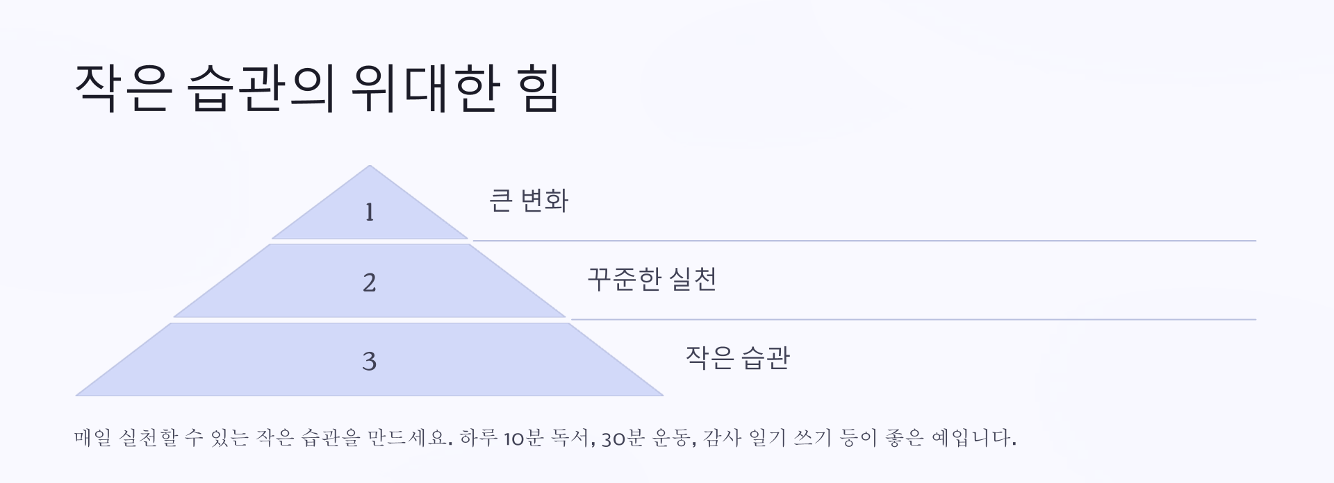 로마는 하루아침에 이루어지지 않았습니다. 거대한 목표도 결국 작은 실천들이 모여 이루어지는 것입니다. 거창한 계획에 얽매이기보다는, 매일 실천할 수 있는 작은 습관을 만드세요. 하루 10분 독서, 30분 운동, 매일 감사 일기 쓰기 등, 작지만 꾸준한 실천이 모여 당신의 삶을 변화시킬 것입니다.