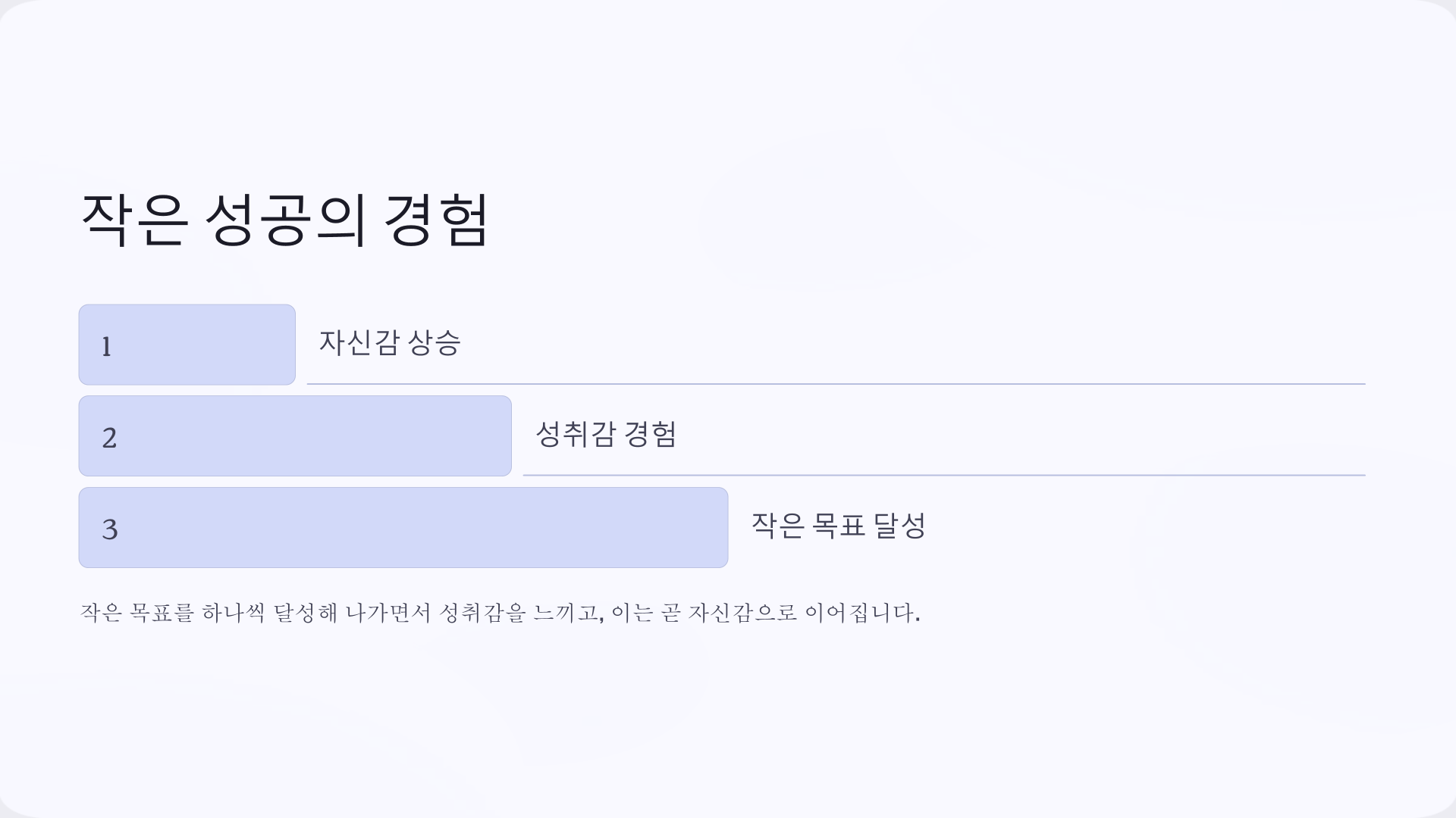 큰 목표를 향해 나아가는 과정에서, 작은 성공 경험은 매우 중요합니다. 작은 목표를 설정하고 이를 하나씩 달성해 나가면서 성취감을 느끼고, 이는 곧 자신감으로 이어집니다. 그리고 이 자신감은 더 큰 목표를 향해 나아갈 수 있는 강력한 추진력이 됩니다.