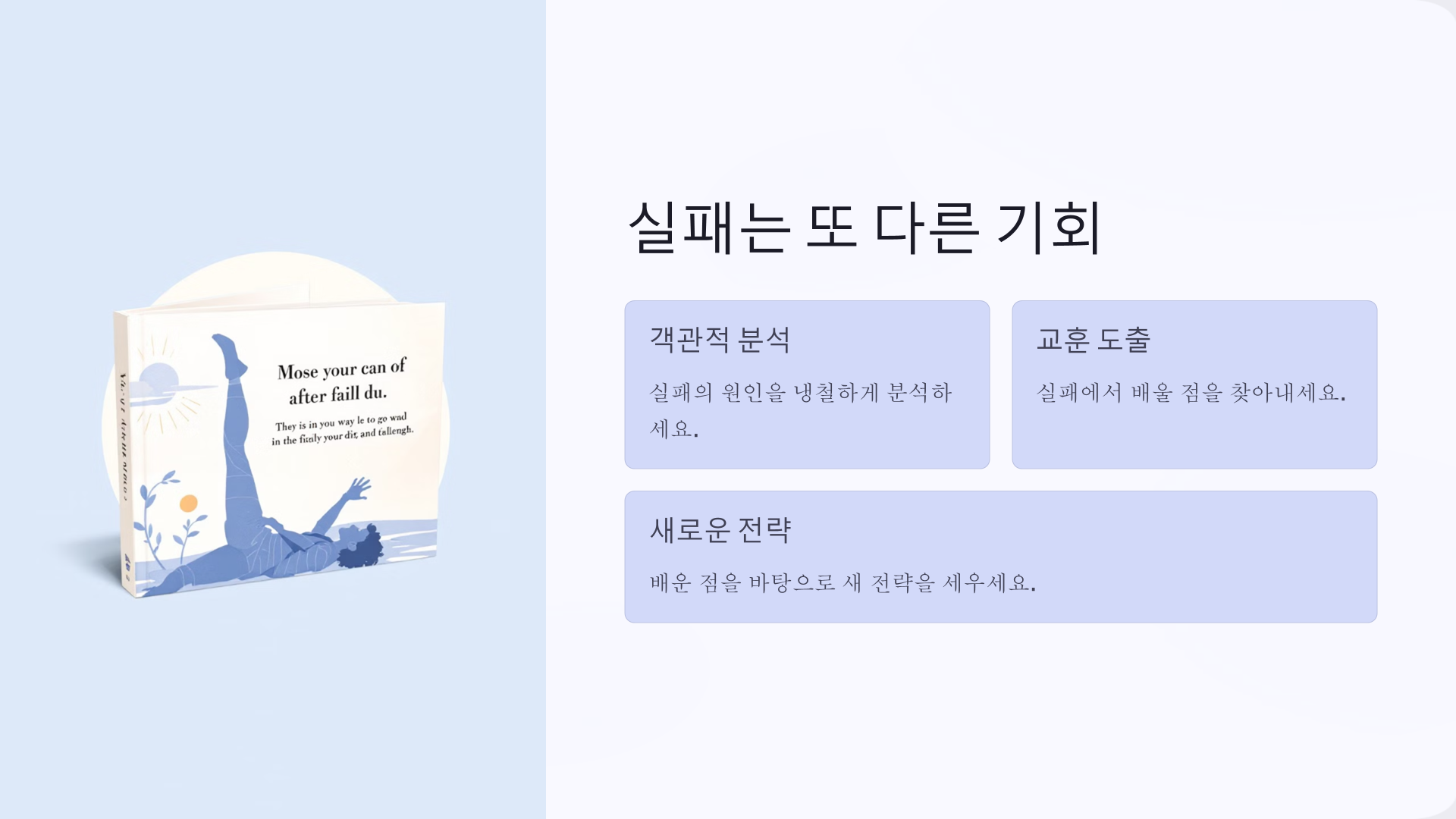 목표를 향해 나아가는 길에는 필연적으로 실패와 좌절이 따릅니다. 중요한 것은 실패에 굴복하지 않고, 이를 통해 배우고 성장하는 것입니다. 실패의 원인을 객관적으로 분석하고, 이를 바탕으로 새로운 전략을 수립하세요. 실패는 끝이 아니라, 새로운 시작을 위한 값진 경험입니다.