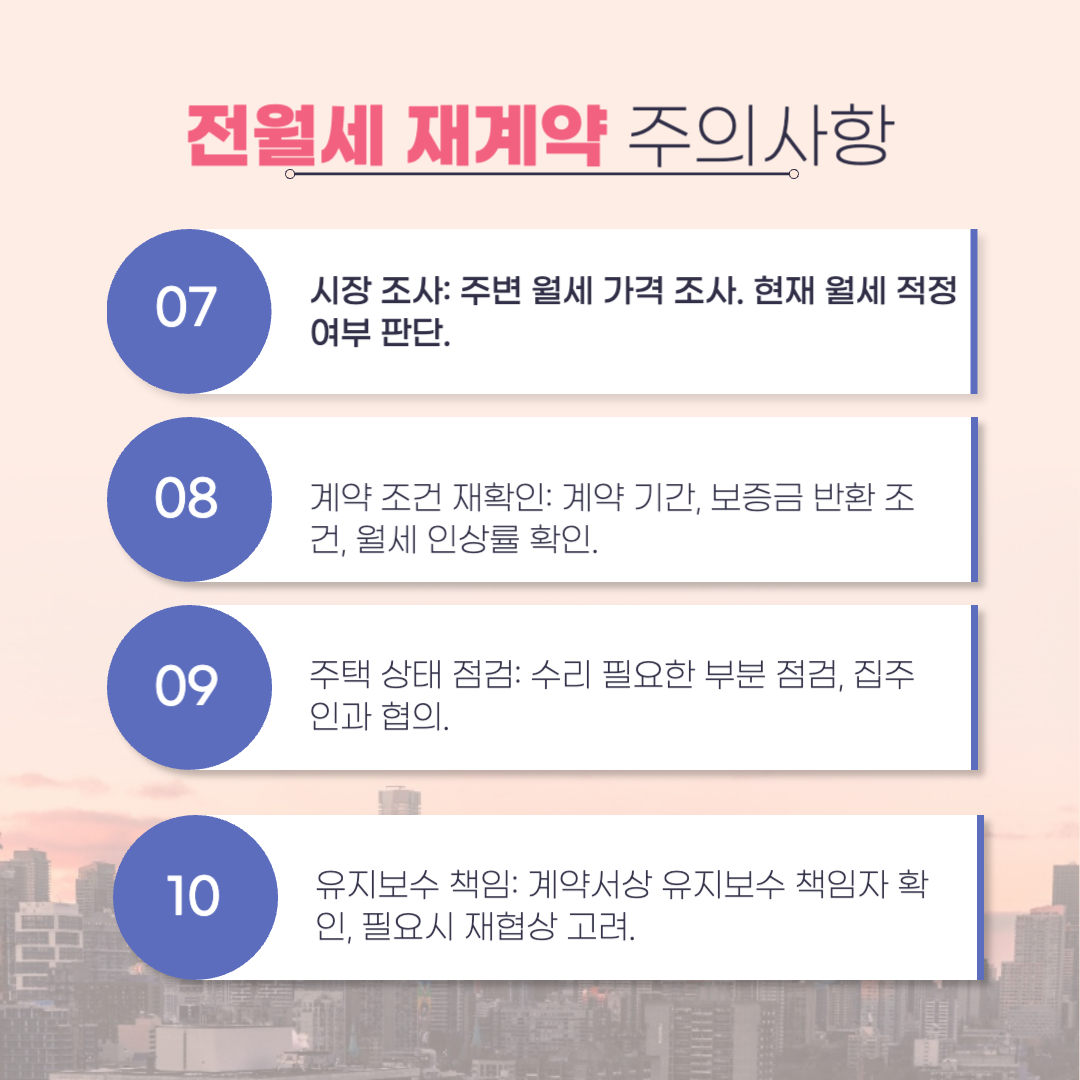 전 월세 재계약시 주의해야 할 사항들에 대해 자세히 알아보았습니다. 재계약 과정은 복잡할 수 있지만, 올바른 정보와 현명한 선택을 통해 안전하고 편안한 자취 생활을 이어나갈 수 있습니다. 시장 조사, 계약 조건 재확인, 주택 상태 점검 등 모든 과정에서 신중을 기해야 합니다. 이러한 준비와 주의를 통해 여러분의 자취방 생활이 보다 안정적이고 만족스러운 것이 되길 바랍니다.