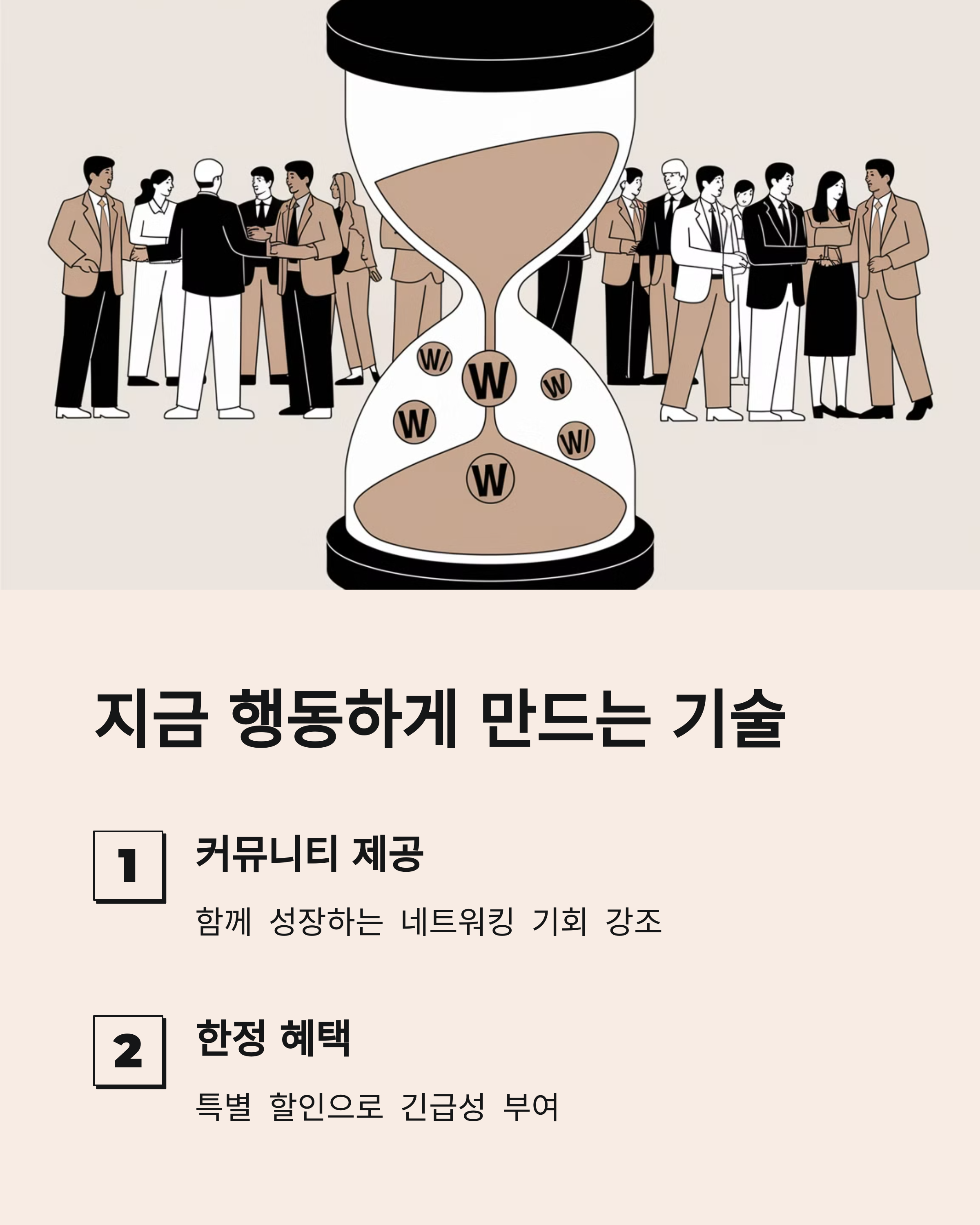 - "지금 결정하세요" 인센티브: 한국인들은 관계를 중요하게 생각합니다. 함께 성장하고 성공할 수 있다는 점을 강조하고, 커뮤니티나 네트워킹 기회를 제공하는 것이 좋습니다. 또한, 기간 한정 혜택이나 특별 할인 등을 통해 긴급성을 부여할 수 있습니다.