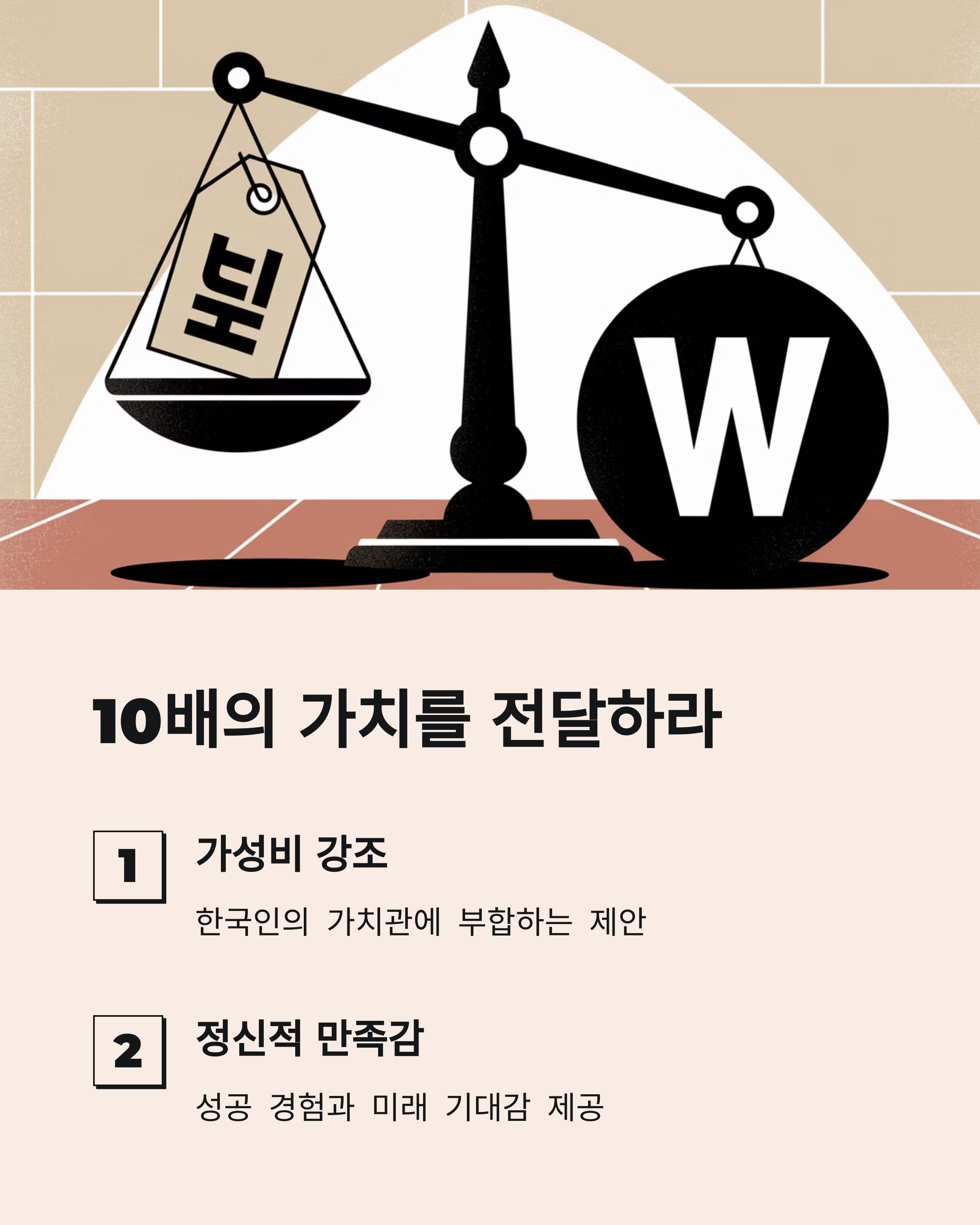 - 10배의 법칙: 한국인들은 가성비를 중요하게 생각합니다. 가격 대비 성능이 뛰어난 제품이나 서비스를 선호합니다. 제안을 할 때, 단순히 가격 대비 가치를 강조하는 것뿐만 아니라, 정신적인 만족감과 성공 경험을 함께 제공해야 합니다. 예를 들어, 강의를 통해 얻을 수 있는 실질적인 변화와 미래에 대한 기대감을 강조하는 것이 좋습니다.