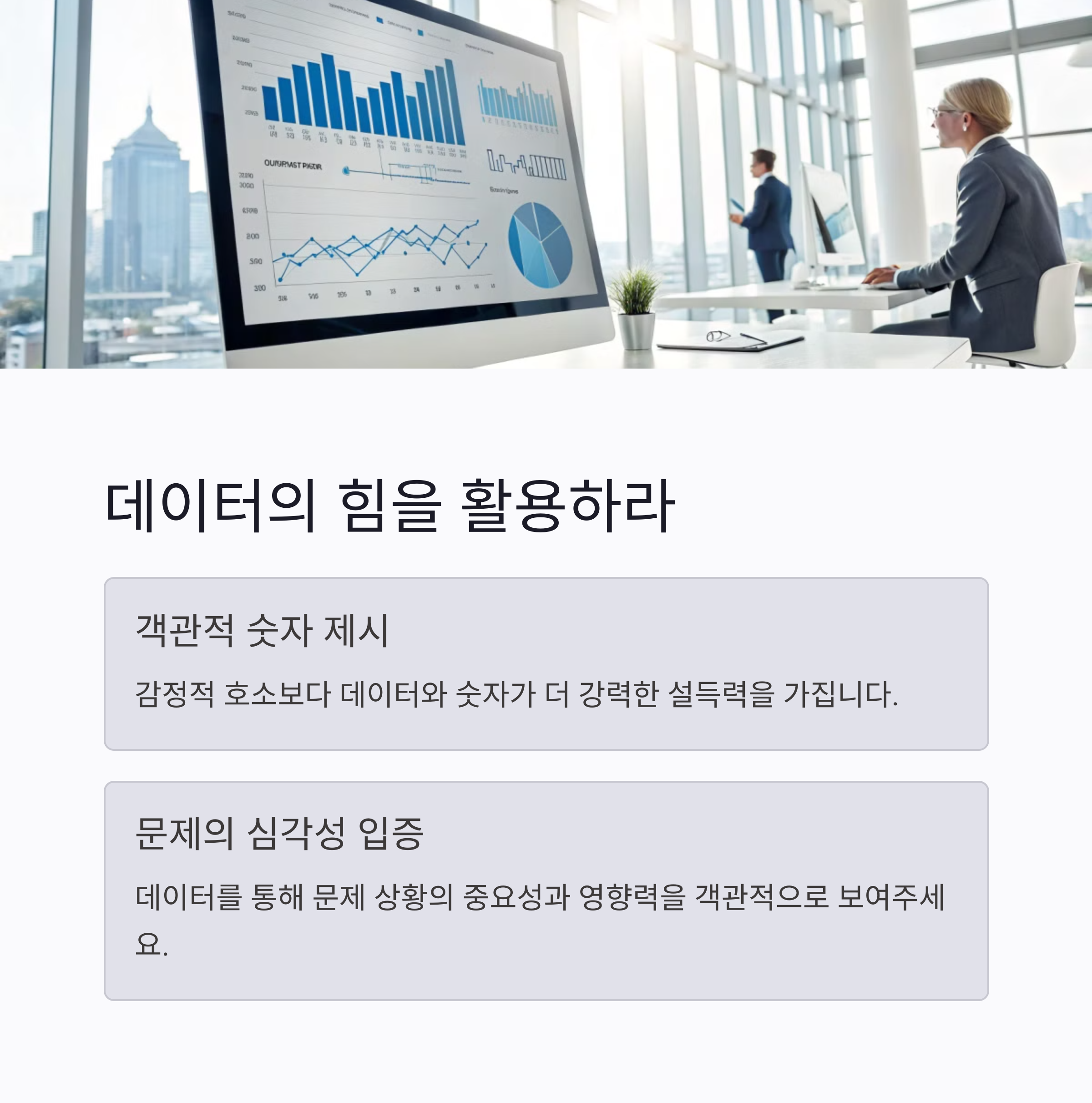 직장에서는 감정적인 호소보다는 객관적인 데이터와 숫자가 훨씬 설득력을 가집니다. 보고서의 서두에 문제 상황을 숫자로 명확하게 제시하고, 이 데이터가 왜 중요한지, 어떤 영향을 미치는지 보여주는 것이 중요합니다. 숫자를 통해 문제의 심각성을 객관적으로 드러내고, 데이터 기반의 해결책을 제시해야 상사의 공감을 얻을 수 있습니다.