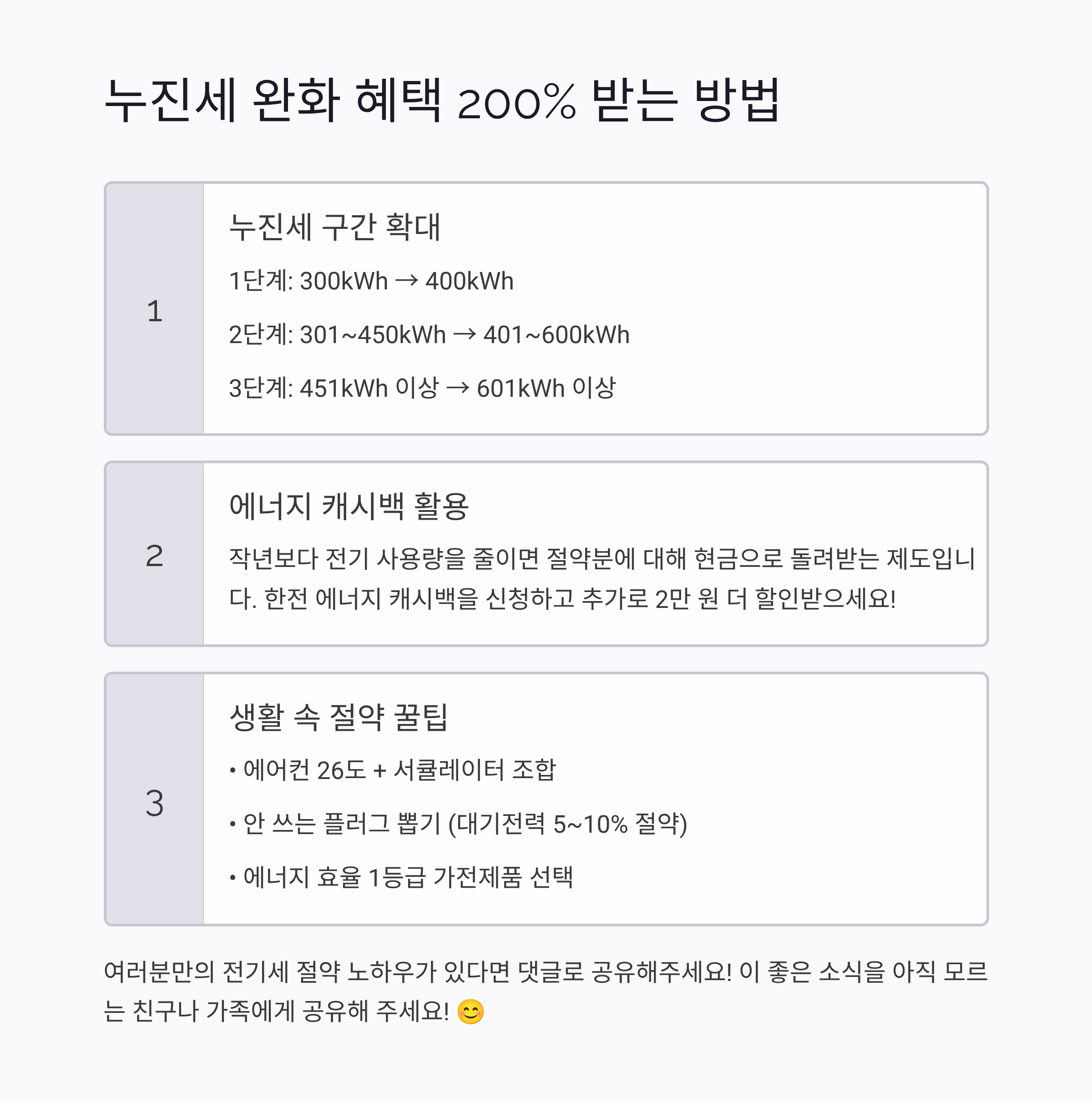 이 좋은 소식, 아직 모르는 친구나 가족이 있나요? 아래 공유 버튼을 눌러 2025년 여름 전기요금 할인 혜택을 널리 알려주세요!